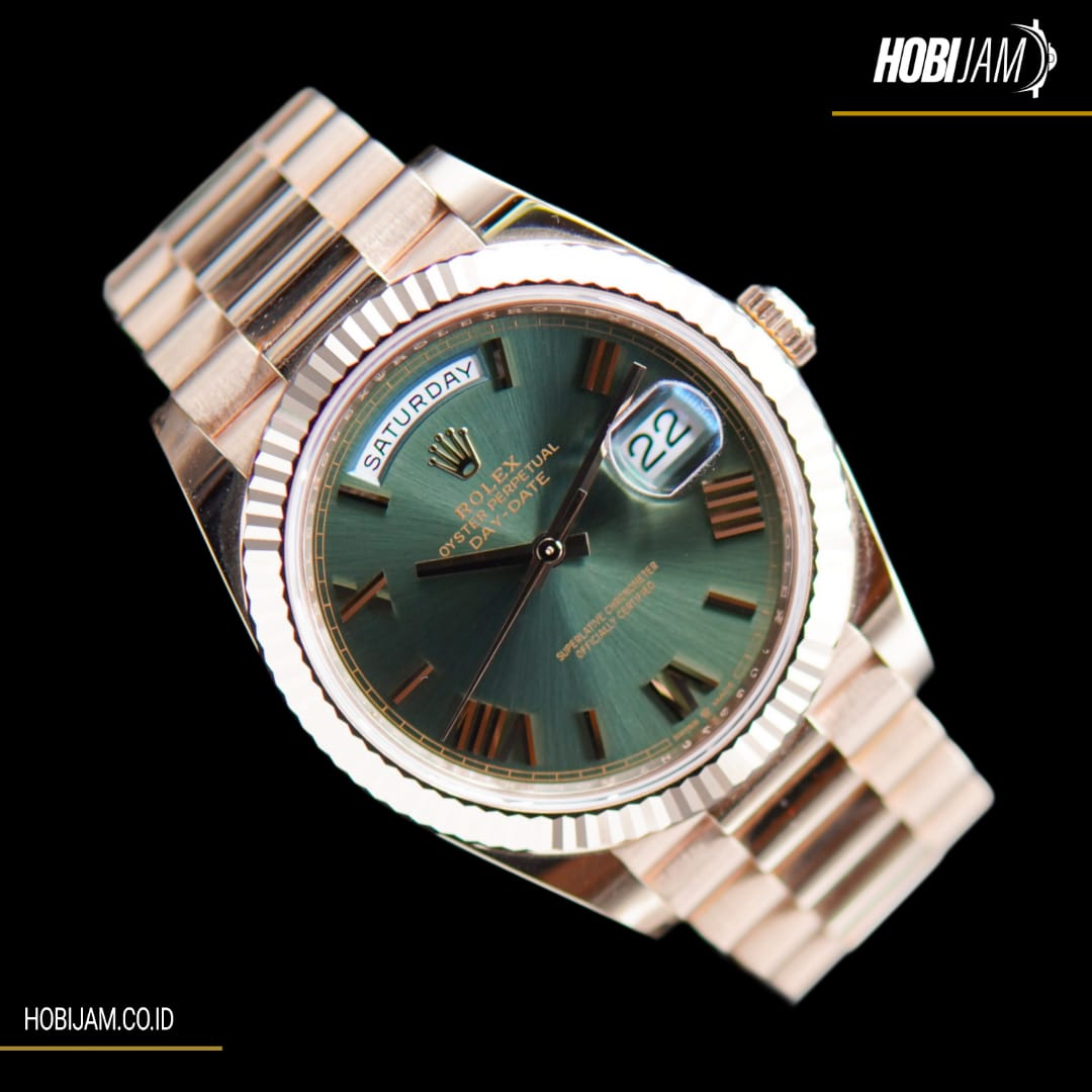 Brand : Rolex Type : Day Date Olive Green Year : 2022 Reference : 228235 Case Material : Rose Gold Diameter : 40mm Movement : Automatic Gender : Men Others : Fullset box and paper